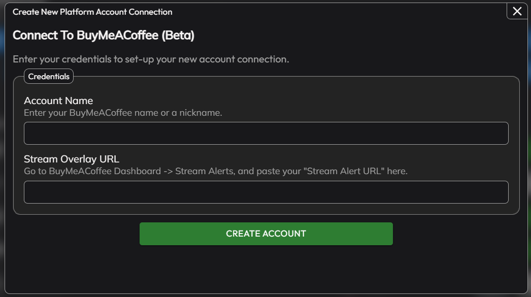 Copy this from your BuyMeACoffee Buttons & Graphics Settings under "Stream alerts" (https://studio.buymeacoffee.com/button-and-graphics), and copy your overlay URL using the button provided at the top of the page.