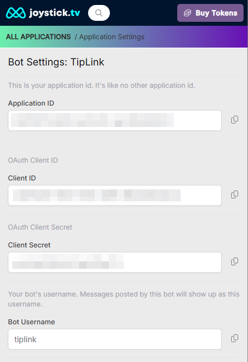 Bot Settings Page on Joystick.TV (after creation - step 9)