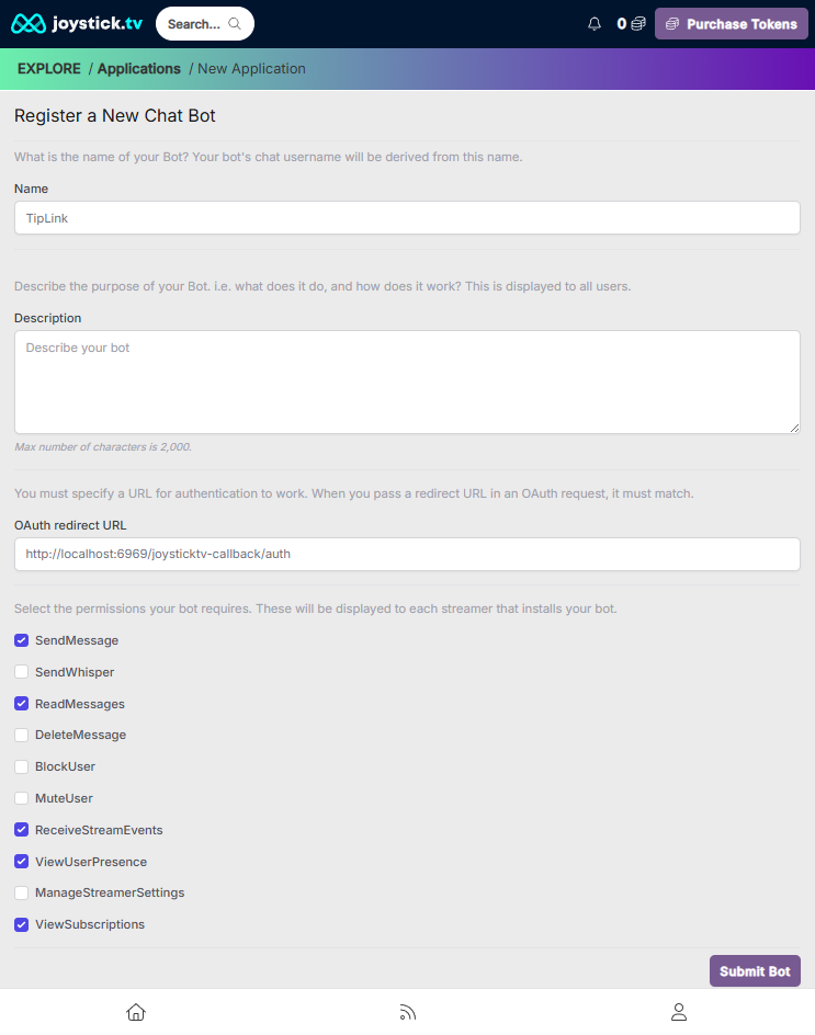 Bot Set-up Page on Joystick.TV (before creation - step 2)