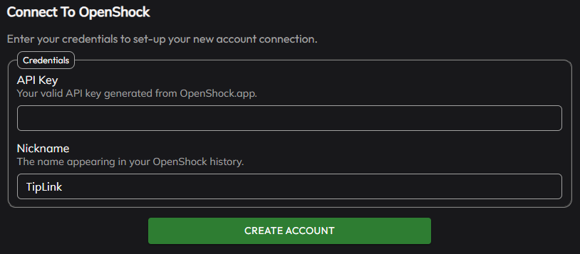Enter the API Key for your OpenShock account, and a memorable nickname to appear in your OpenShock history window.